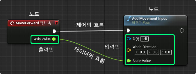 ② 노드와 노드 사이는 제어(명령)와 데이터가 전송되며, 제어와 데이터의 흐름은 선(Wire)으로 연결한다.